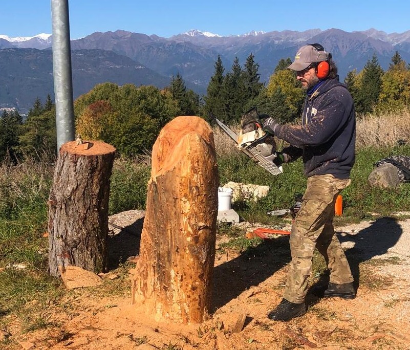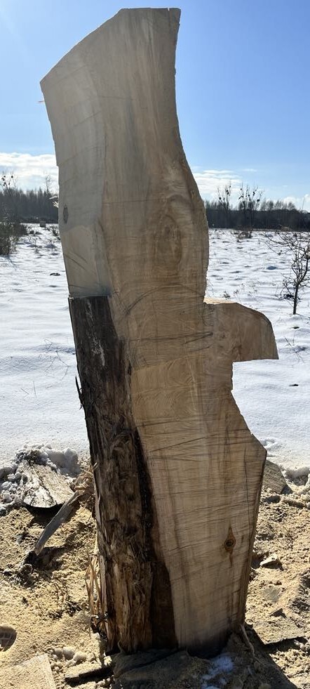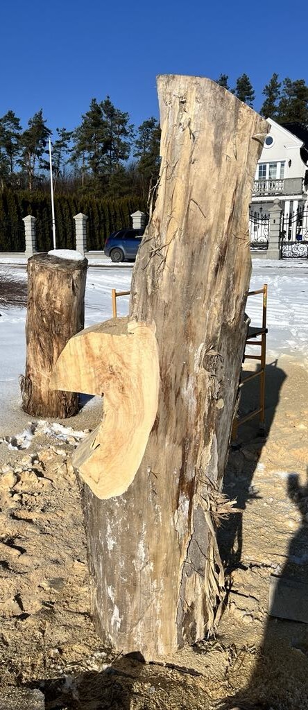 Rzeźba powstawała etapami — od ciosów zgrubnych piłą łańcuchową po precyzyjne, ręczne dopracowanie detali.